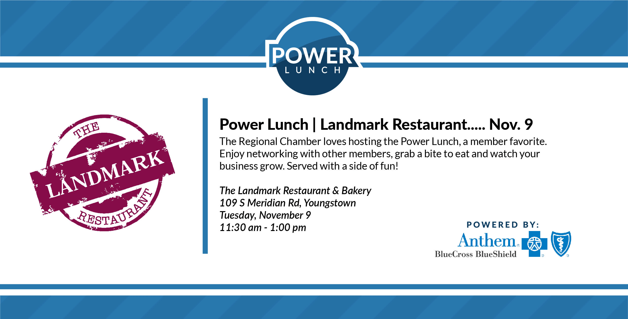 Connect with Chamber member friends at our Power Lunch! We will provide a complete roster at the time of the event so that you can follow-up with your fellow members.